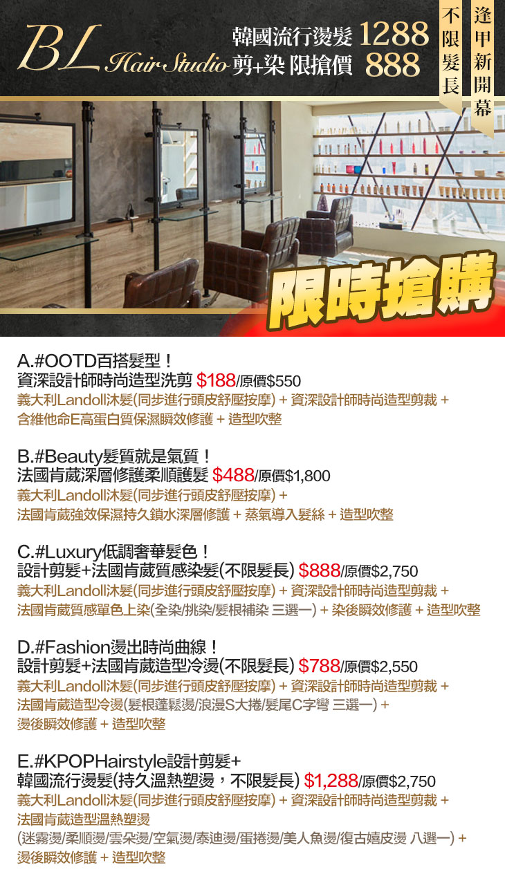 A.#OOTD百搭髮型!資深設計師時尚造型洗剪 / B.#Beauty髮質就是氣質!法國肯葳深層修護柔順護髮 / C.#Luxury低調奢華髮色!設計剪髮+法國肯葳質感染髮(不限髮長) / D.#Fashion燙出時尚曲線!設計剪髮+法國肯葳造型冷燙(不限髮長) / E.#KPOPHairstyle設計剪髮+韓國流行燙髮(持久溫熱塑燙,不限髮長)