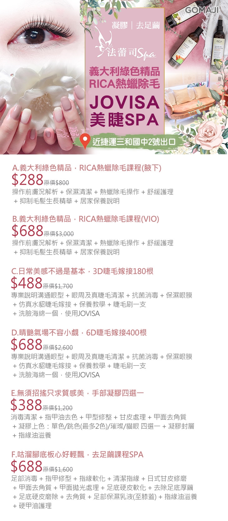 A.義大利綠色精品,RICA熱蠟除毛課程(腋下) / B.義大利綠色精品,RICA熱蠟除毛課程(VIO) / C.日常美感不過是基本,3D睫毛嫁接180根 / D.睛艷氣場不容小覷,6D睫毛嫁接400根 / E.無須招搖只求質感美,手部凝膠四選一 / F.咕溜腳底板心好輕飄,去足繭課程SPA