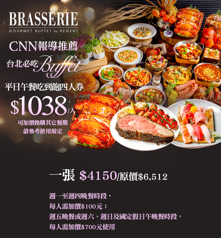 (一張即出貨)CNN推薦台北必吃自助餐!平日午餐自助吃到飽四人券(週一至週四晚餐時段,每人需加價$100元;週五晚餐或週六、週日及國定假日午晚餐時段,每人需加價$700元使用)