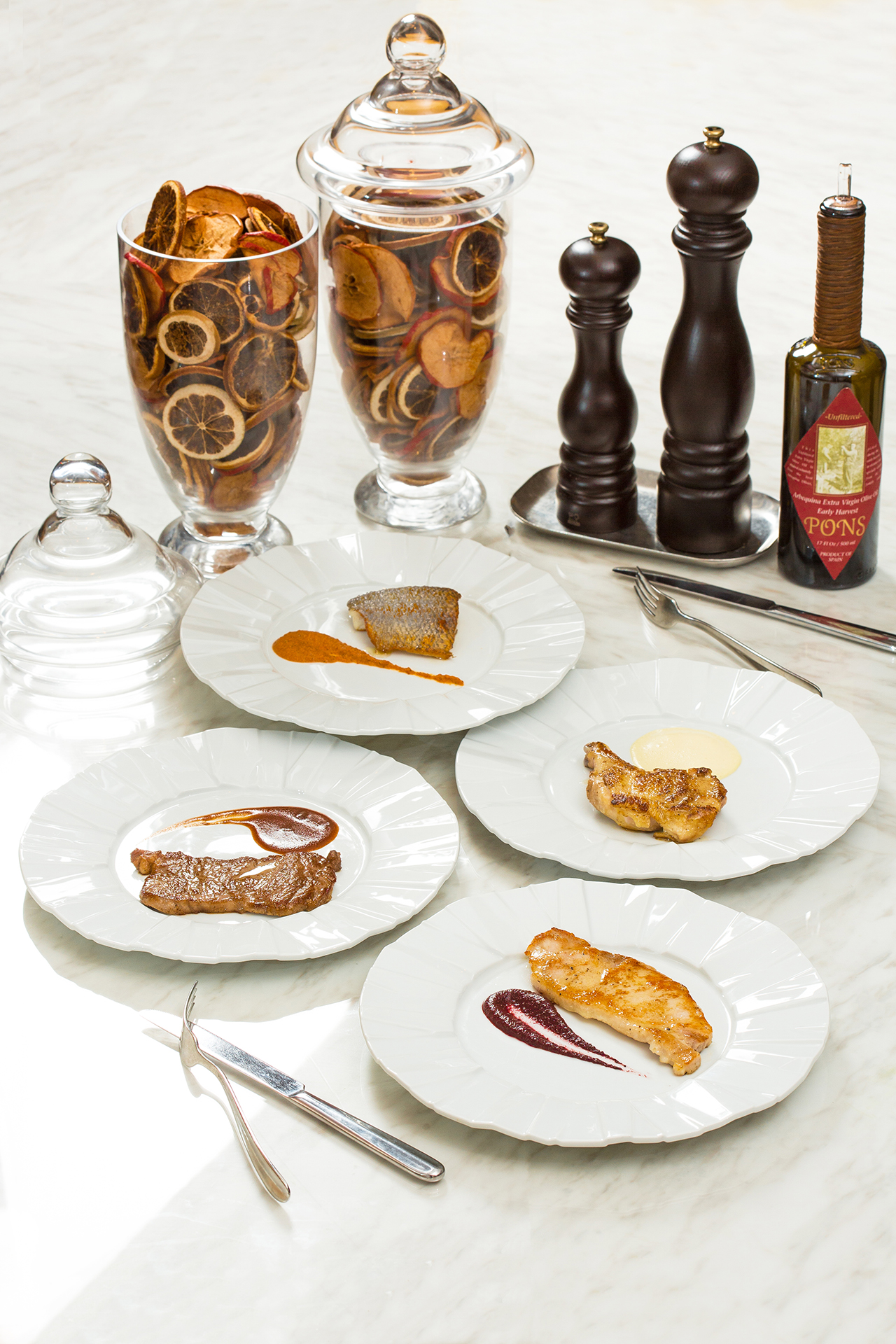 選用宜蘭巴克夏自然豬,熟成七天增添風味並以牛奶浸泡一夜,讓肉質軟嫩同時達到去腥效果,經過煎烤將外皮上色,肉質散發甘美乳香的迷人風采,搭配整顆蘋果熬煮四小時精華的蘋果醬,襯出酸甜新滋味。