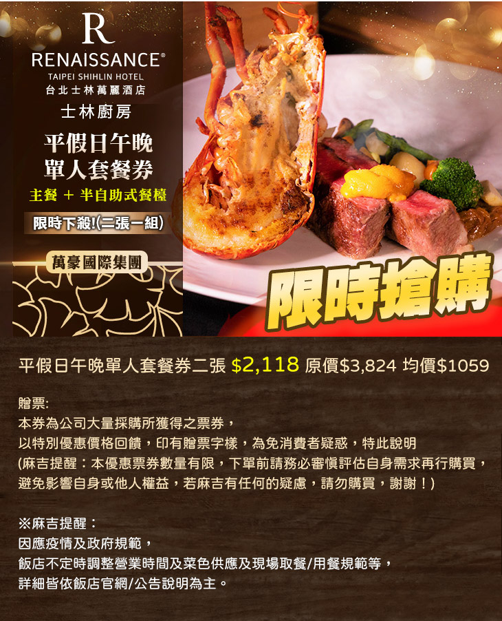 限時下殺!(二張一組)平假日午晚單人套餐券(可享1580元+10%含主餐 + 半自助式餐檯)(詳細依券面/飯店為主)效期至2023/01/31
