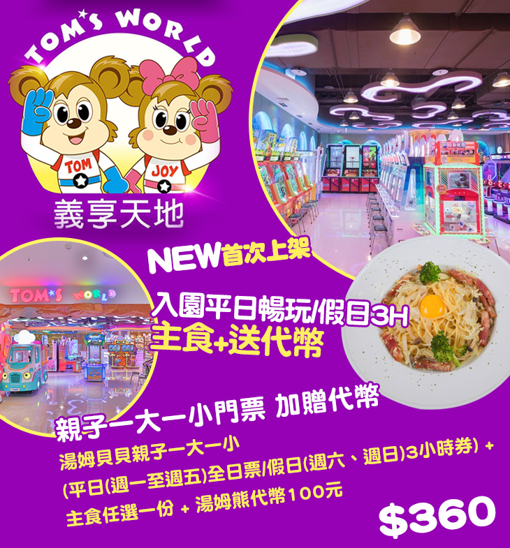 〈含湯姆貝貝親子一大一小(平日(週一至週五)全日票/假日(週六、週日)3小時券) + 主食任選一份 + 湯姆熊代幣100元〉