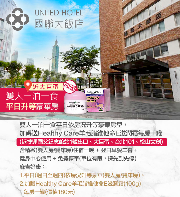 ➯ Gomaji首賣!雙人住宿含翌日豐盛早餐,平日(週日至週四)依房況升等豪華(雙人房/雙床房),再加碼送Healthy Care羊毛脂維他命E滋潤霜(100g)每房一罐!