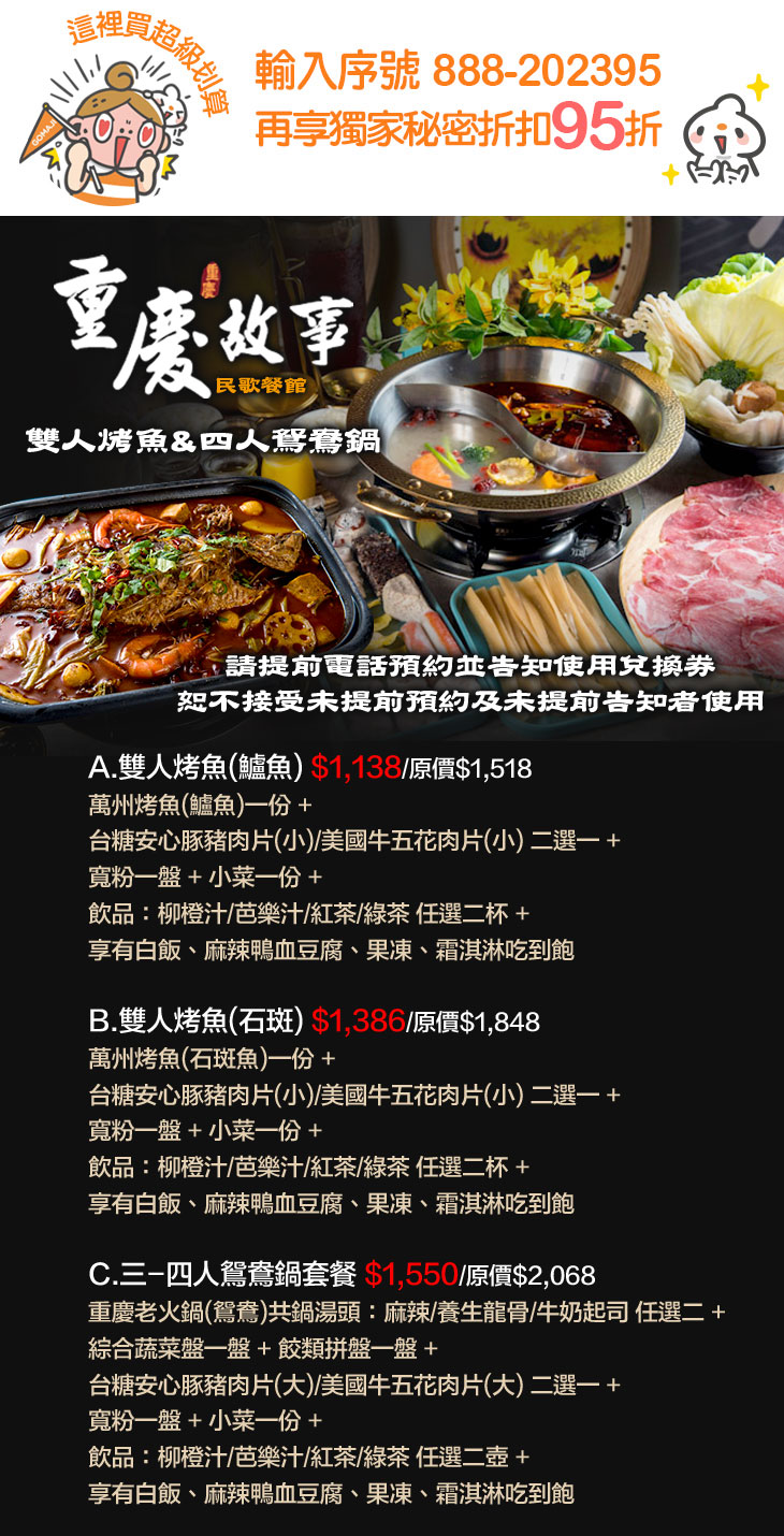 喜歡吃重慶烤魚的朋友有口福啦!位於台南市安平區永華路二段上的【重慶故事民歌餐館】,就是一間超道地的重慶料理店!老闆娘的媽媽是重慶人,不僅傳承母親的好手藝,使用的食材和香料也都是來自於重慶,那獨到的口味絕非一般餐廳可相比呀!店內主打重慶烤魚和麻辣鍋,集結了香、麻、辣的好滋味,讓人越吃越過癮!用餐環境寬敞舒適,搭配柔和的燈光與優美的花草點綴,就像來到小型花園一般,營造出美好愜意的氛圍!另外還有駐唱表演可觀賞,讓您一邊吃飯一邊聽歌,享受最Chill的用餐時光!