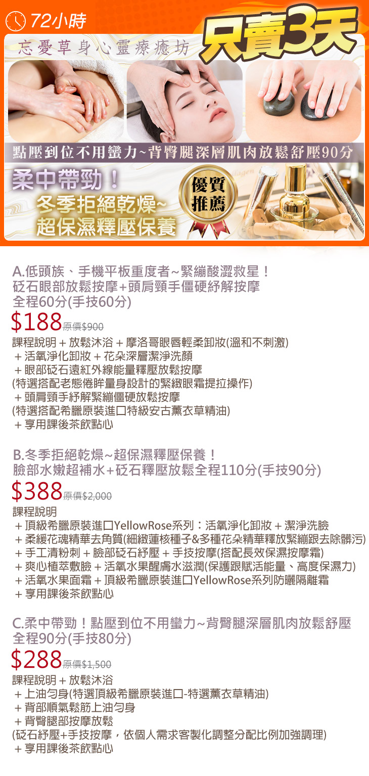 A.低頭族、手機平板重度者~緊繃酸澀救星!砭石眼部放鬆按摩+頭肩頸手僵硬紓解按摩全程60分(手技60分) / B.冬季拒絕乾燥~超保濕釋壓保養!臉部水嫩超補水+砭石釋壓放鬆全程110分(手技90分) / C.柔中帶勁!點壓到位不用蠻力~背臀腿深層肌肉放鬆舒壓全程90分(手技80分)