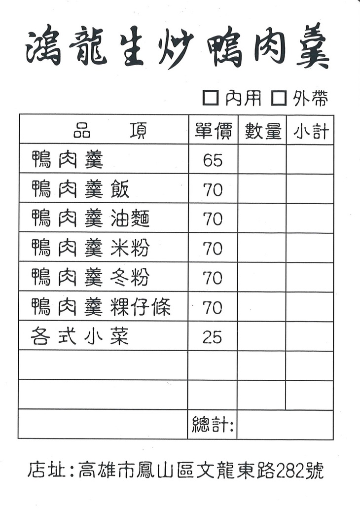 位於高雄市鳳山區文龍東路上的【鴻龍生炒鴨肉羹】,嚴選食材製作一道道美味餐點,濃濃的台灣味深深擄獲客人的心,無論是在備料或烹煮上,每個製程都嚴格控管,慢工細活、用心製作出兼顧美味及健康的傳統古早味!四溢的香氣、樸實的美味,每一口都讓人感到好滿足,歡迎全家大小一同來嚐鮮唷!