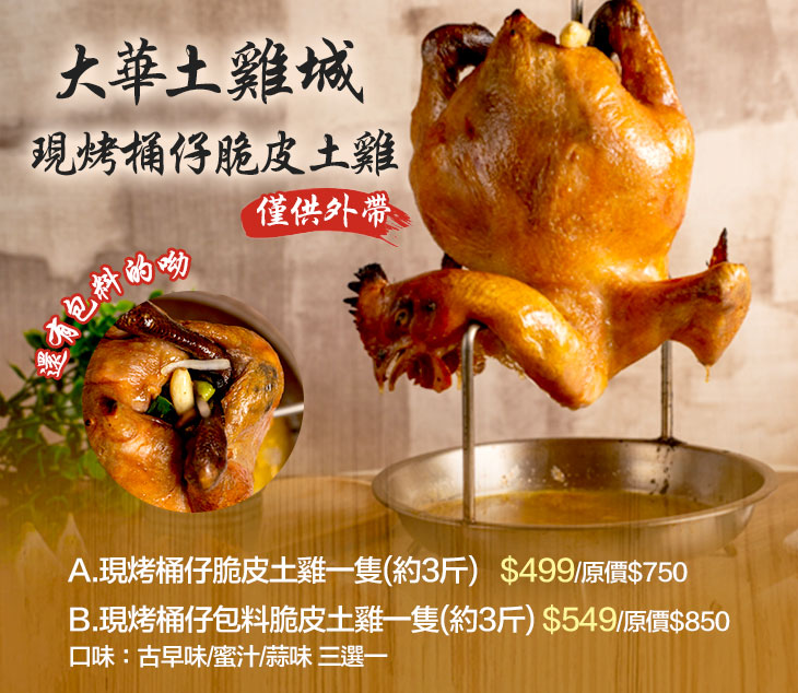 B.現烤桶仔包料脆皮土雞一隻(約3斤) 〈口味:古早味/蜜汁/蒜味 三選一〉