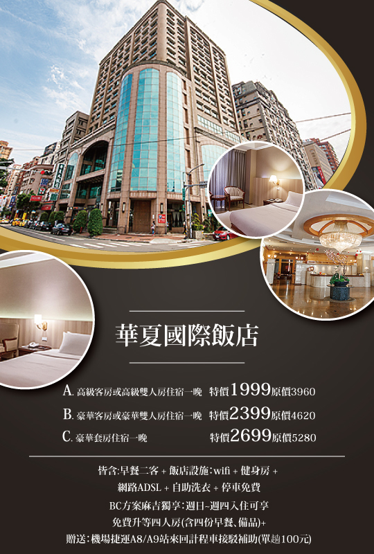 鄰近林口三井Outlet、林口長庚紀念醫院、龜山運動公園的華夏國際飯店,兼具商務與休閒功能,飯店內簡約典雅的設計、專業用心的服務團隊,以及林口交流道的優異地理位置,不但為進出國際機場的首選商務飯店,也為在北部旅遊住宿時最方便的家。