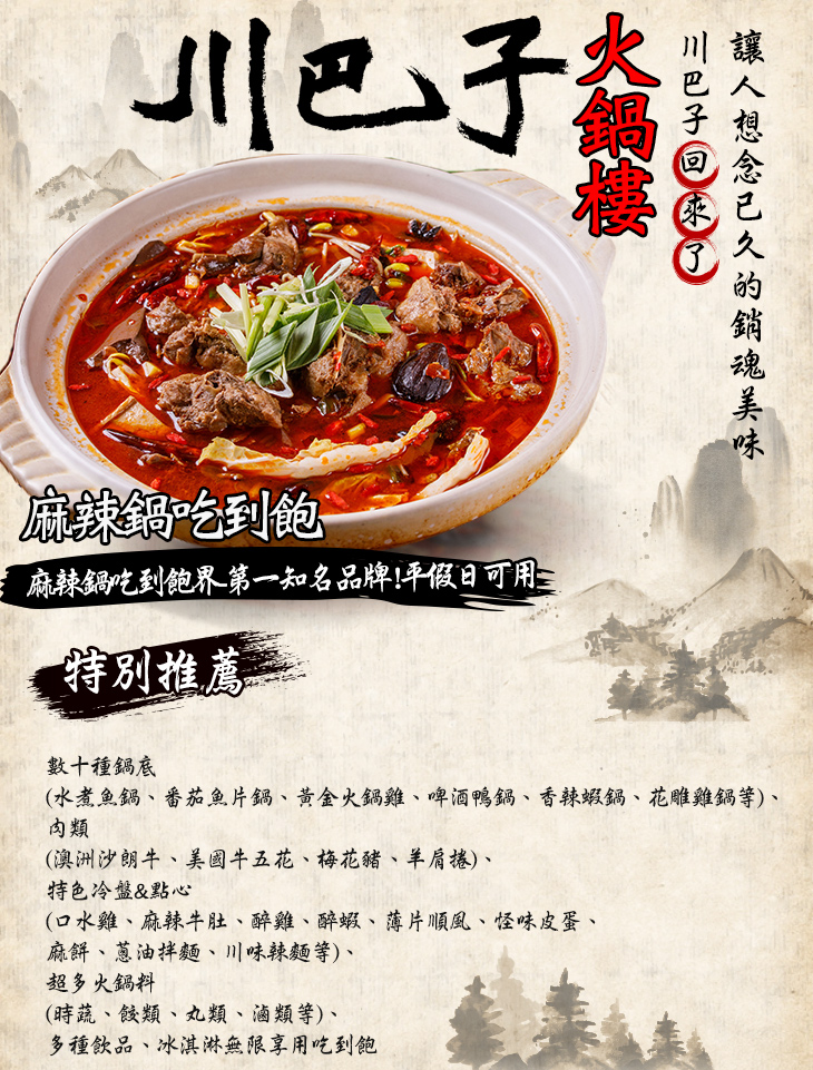 ★ 知名30年麻辣鍋吃到飽人氣老店-【川巴子】強勢回歸!★