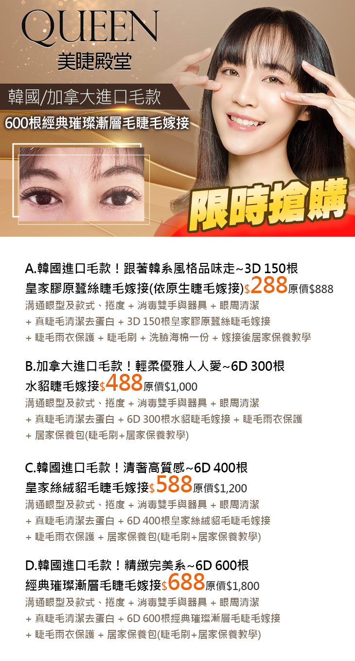 A.韓國進口毛款!跟著韓系風格品味走~3D 150根皇家膠原蠶絲睫毛嫁接(依原生睫毛嫁接) / B.加拿大進口毛款!輕柔優雅人人愛~6D 300根水貂睫毛嫁接 / C.韓國進口毛款!清奢高質感~6D 400根皇家絲絨貂毛睫毛嫁接 / D.韓國進口毛款!精緻完美系~6D 600根經典璀璨漸層毛睫毛嫁接