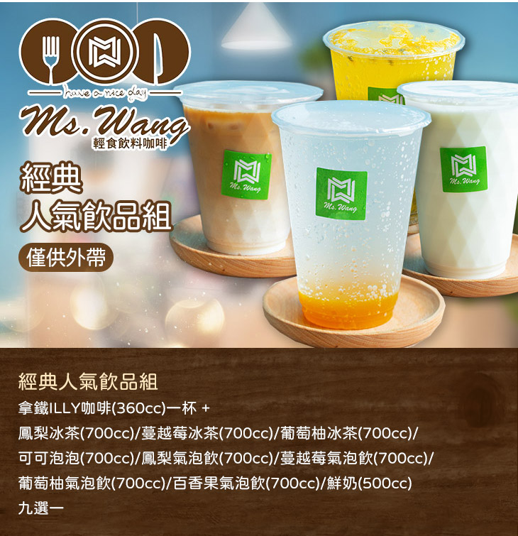 憑藉高CP值的特色深受廣大民眾喜愛,《Ms.Wang輕食飲料咖啡》推出優惠外帶方案啦~共有九款人氣飲品任君挑選,且還搭配一杯拿鐵咖啡,買到賺到、幸福破表。最重要的是,平假日皆可使用,無論何時感到口渴、想來點喝的,只需輕輕一按購買按鈕,進行線上訂餐,就能迅速擁有好喝、優質的特調飲料,如此方便又超值的大好機會,麻吉們可千萬別錯過囉!