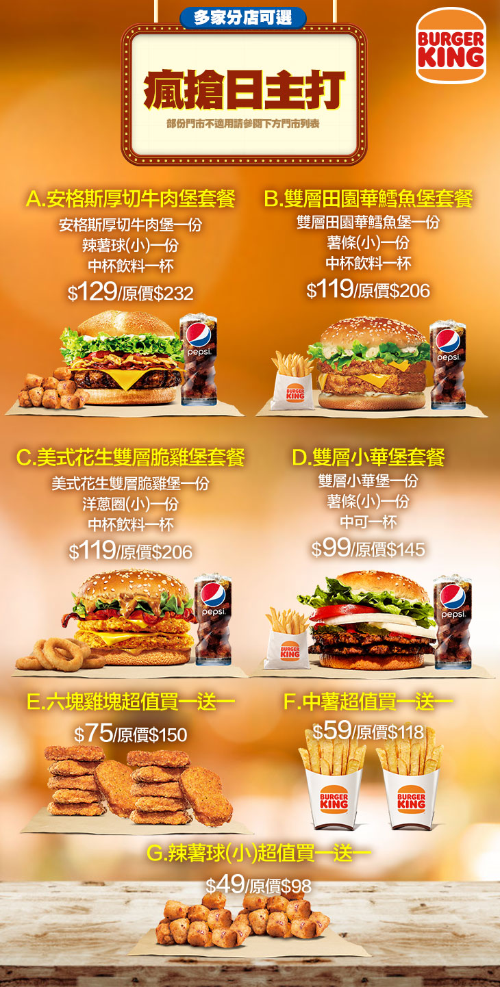 24HR 瘋搶日主打!A.安格斯厚切牛肉堡套餐 / B.雙層田園華鱈魚堡套餐 / C.美式花生雙層脆雞堡套餐 / D.雙層小華堡套餐 / E.六塊雞塊超值買一送一 / F.中薯超值買一送一