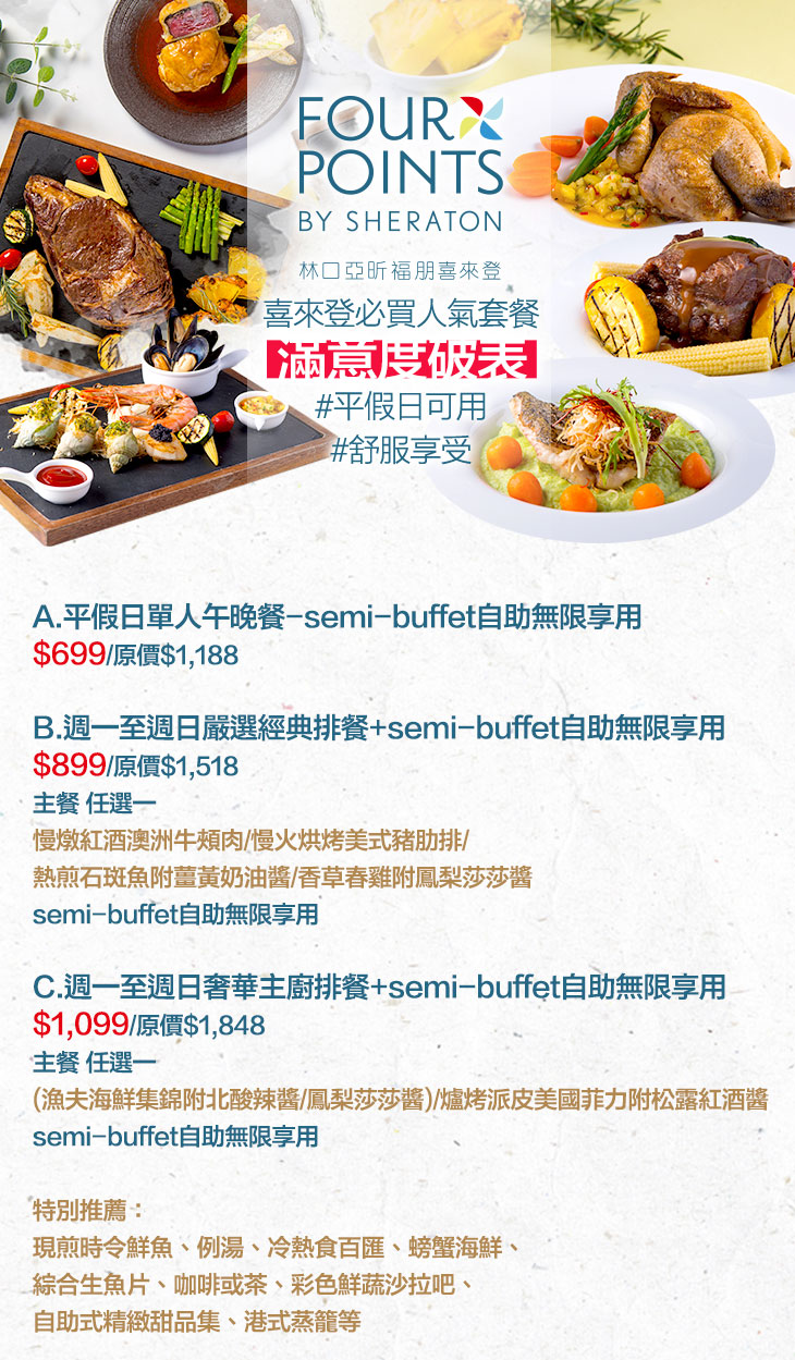 A.平假日單人午晚餐-自助吧無限享用 / B.週一至週日嚴選經典排餐+semi-buffet自助無限享用 / C.週一至週日奢華主廚排餐+semi-buffet自助無限享用