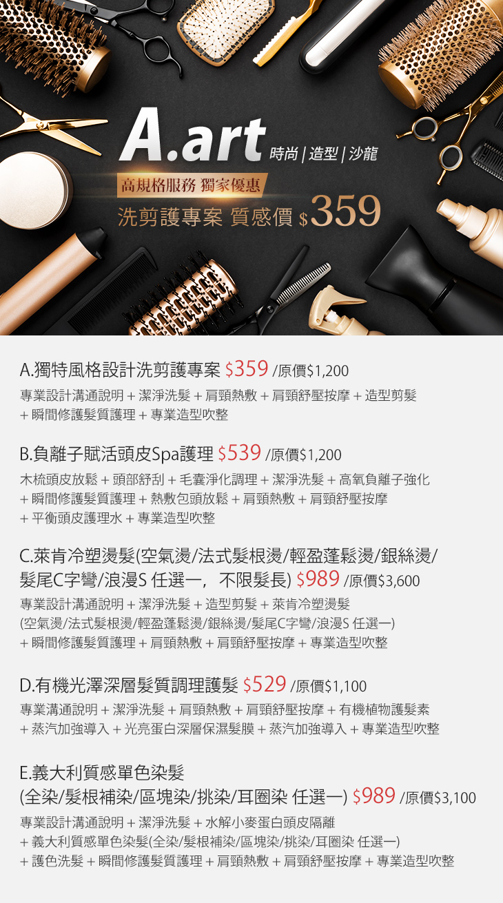 A.獨特風格設計洗剪護專案 / B.負離子賦活頭皮Spa護理 / C.萊肯冷塑燙髮(空氣燙/法式髮根燙/輕盈蓬鬆燙/銀絲燙/髮尾C字彎/浪漫S 任選一,不限髮長) / D.有機光澤深層髮質調理護髮 / E.義大利質感單色染髮(全染/髮根補染/區塊染/挑染/耳圈染 任選一)