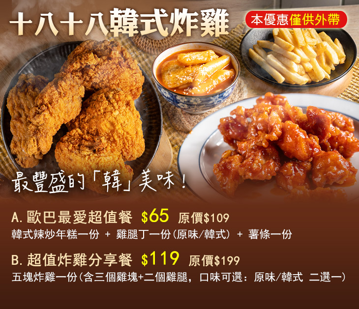 【十八十八韓式炸雞】提供口味道地的韓國料理,從韓國人最愛的國民美食-韓式炸雞,至街頭常見的韓式炒年糕都有,豐富的選擇,讓您品味最豐盛的「韓」美味!