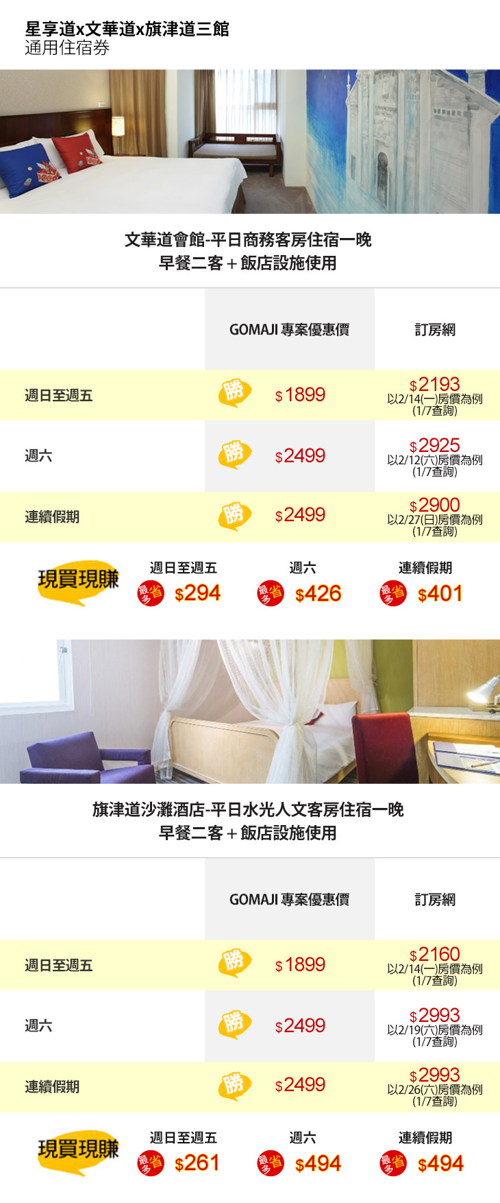 ★ 只賣3天!星享道酒店集團三館通用住宿券,一張可入住文華道及旗津道雙人房,也可加價入住星享道或升等房型多人使用,皆含翌日早餐使用,買越多省越多!