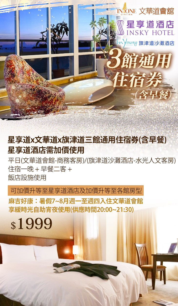 星享道x文華道x旗津道三館通用住宿券(含早餐),星享道酒店需加價使用,麻吉好康:暑假7~8月週一至週四入住文華道會館享緩時光自助宵夜使用