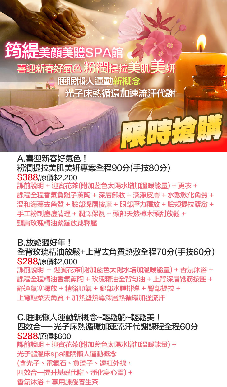 A.喜迎新春好氣色!粉潤提拉美肌美妍專案全程90分(手技80分) / B.放鬆過好年!全背玫瑰精油放鬆+上背去角質熱敷全程70分(手技60分) / C.睡眠懶人運動新概念~輕鬆躺~輕鬆美!四效合一~光子床熱循環加速流汗代謝課程全程60分