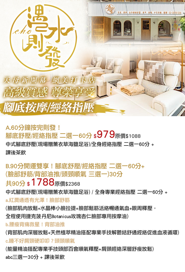 B.90分開運雙享!腳底舒壓/經絡指壓 二選一60分+(臉部舒筋/背部油推/頭頸順氣 三選一)30分共90分
