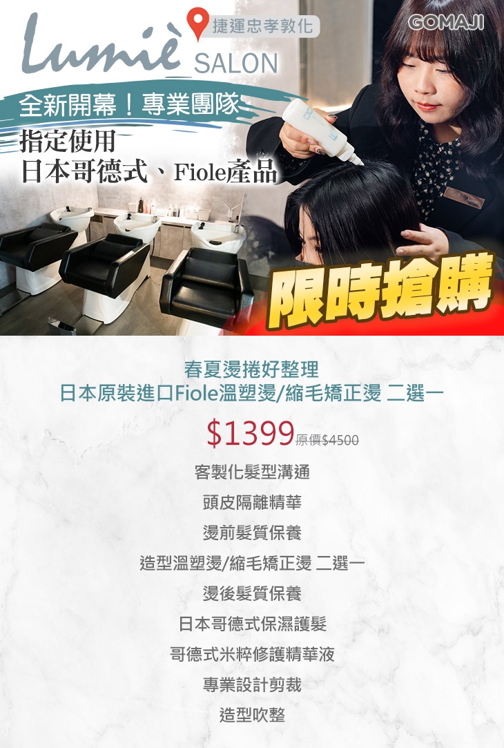 〈客製化髮型溝通 + 頭皮隔離精華 + 燙前髮質保養 + 造型溫塑燙/縮毛矯正燙 二選一 + 燙後髮質保養 + 日本哥德式保濕護髮 + 哥德式米粹修護精華液 + 專業設計剪裁 + 造型吹整〉