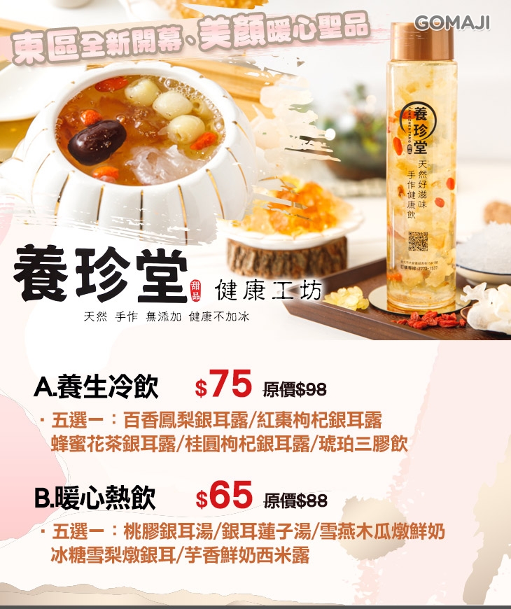 位於捷運忠孝敦化站附近的【養珍堂健康工坊】,跟隨現代人健康觀念興起的步調下,養珍堂追求健康用料的標準與高營養的訴求,打造出不一樣的甜飲品市場。無論是加入多種養生食材、鮮果及蜂蜜調製而成的冰涼銀耳露,還是暖心美味的熱甜湯,都是店家用心的成果,健康好喝、營養滿分,讓您享用飲品也不怕負擔!