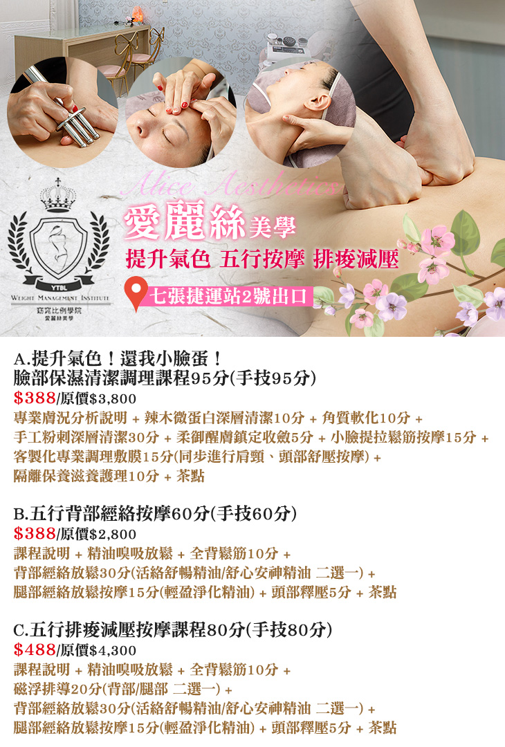 A.提升氣色!還我小臉蛋!臉部保濕清潔調理課程95分(手技95分) / B.五行背部經絡按摩60分(手技60分) / C.五行排痠減壓按摩課程80分(手技80分)