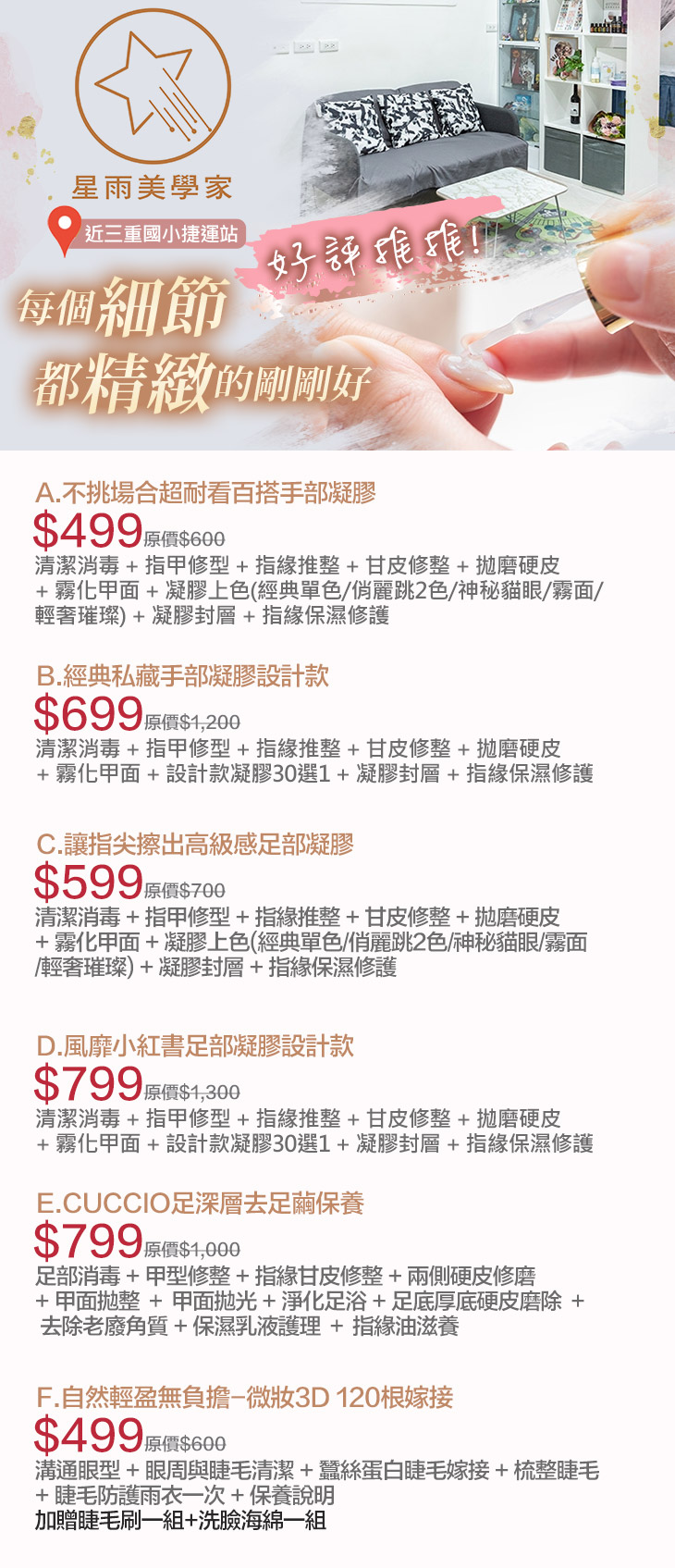 A.不挑場合超耐看百搭手部凝膠 / B.經典私藏手部凝膠設計款 / C.讓指尖擦出高級感足部凝膠 / D.風靡小紅書足部凝膠設計款 / E.CUCCIO足深層去足繭保養 / F.自然輕盈無負擔-微妝3D 120根嫁接
