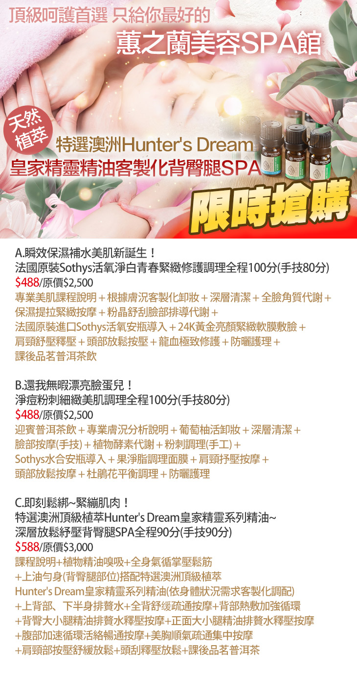 A.瞬效保濕補水美肌新誕生!法國原裝Sothys活氧淨白青春緊緻修護調理全程100分(手技80分) / B.還我無暇漂亮臉蛋兒!淨痘粉刺細緻美肌調理全程100分(手技80分) / C.即刻鬆綁~緊繃肌肉!特選澳洲頂級植萃Hunter's Dream皇家精靈系列精油~深層放鬆紓壓背臀腿SPA全程90分(手技90分)