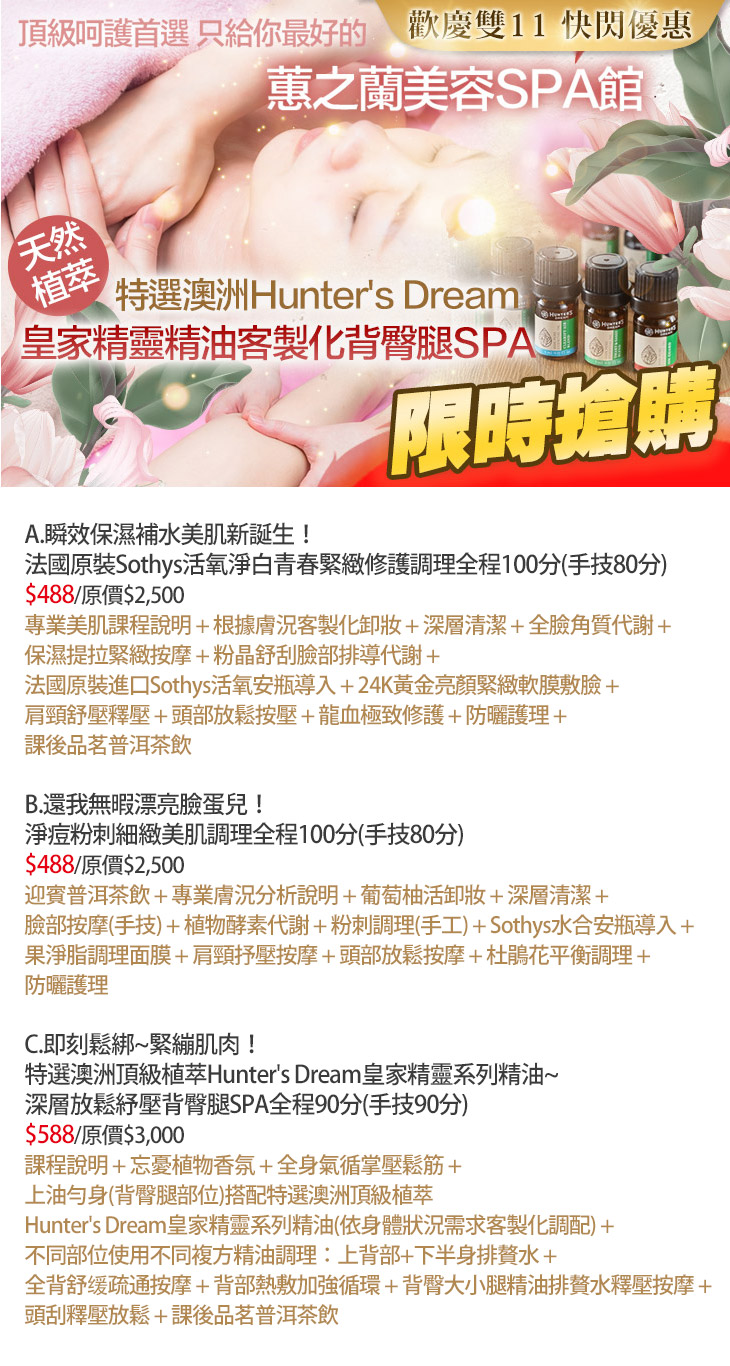 A.瞬效保濕補水美肌新誕生!法國原裝Sothys活氧淨白青春緊緻修護調理全程100分(手技80分) / B.還我無暇漂亮臉蛋兒!淨痘粉刺細緻美肌調理全程100分(手技80分) / C.即刻鬆綁~緊繃肌肉!特選澳洲頂級植萃Hunter's Dream皇家精靈系列精油~深層放鬆紓壓背臀腿SPA全程90分(手技90分)