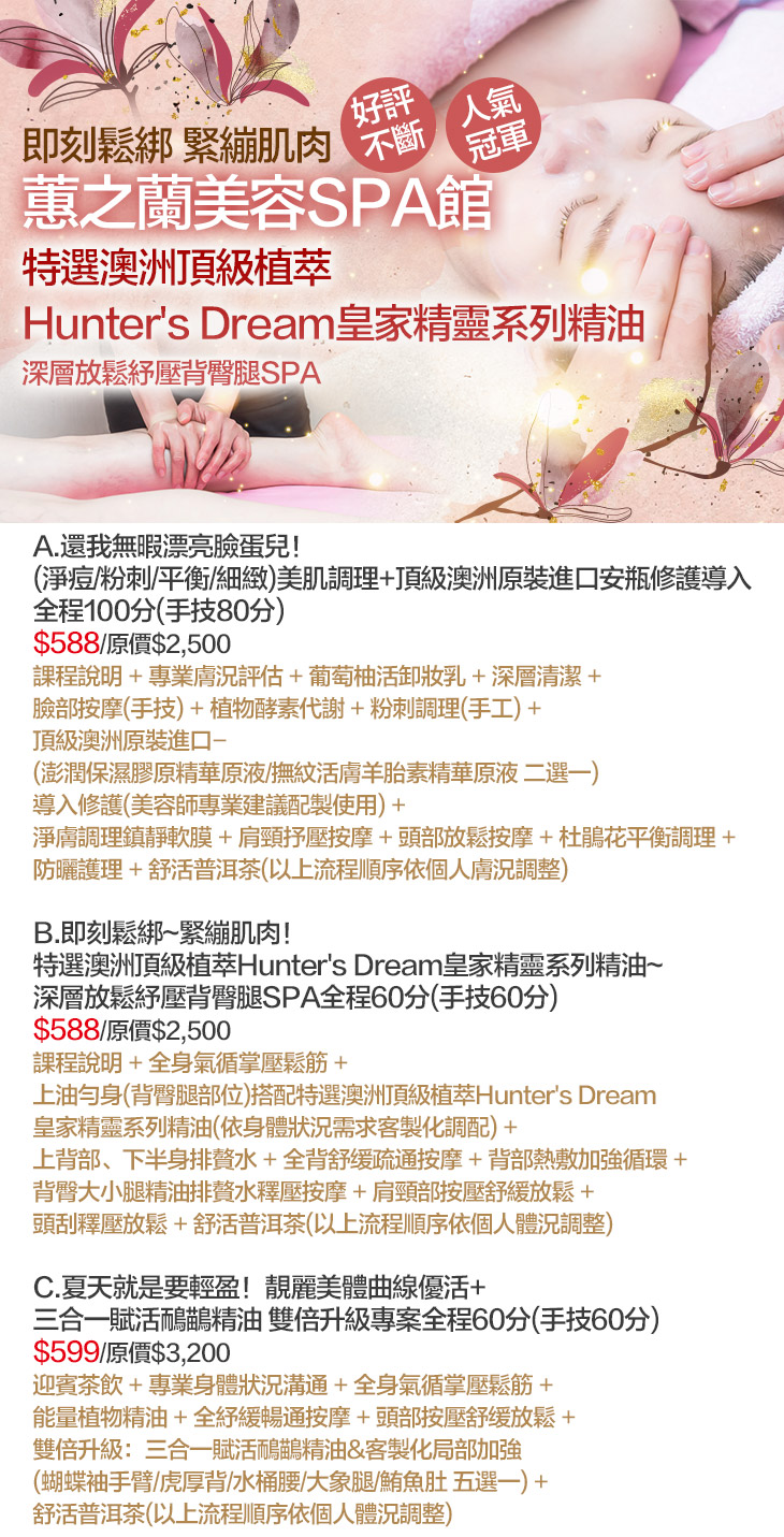 A.還我無暇漂亮臉蛋兒!(淨痘/粉刺/平衡/細緻)美肌調理+頂級澳洲原裝進口安瓶修護導入全程100分(手技80分) / B.即刻鬆綁~緊繃肌肉!特選澳洲頂級植萃Hunter's Dream皇家精靈系列精油~深層放鬆紓壓背臀腿SPA全程60分(手技60分) / C.夏天就是要輕盈!靚麗美體曲線優活+三合一賦活鴯鶓精油 雙倍升級專案全程60分(手技60分)