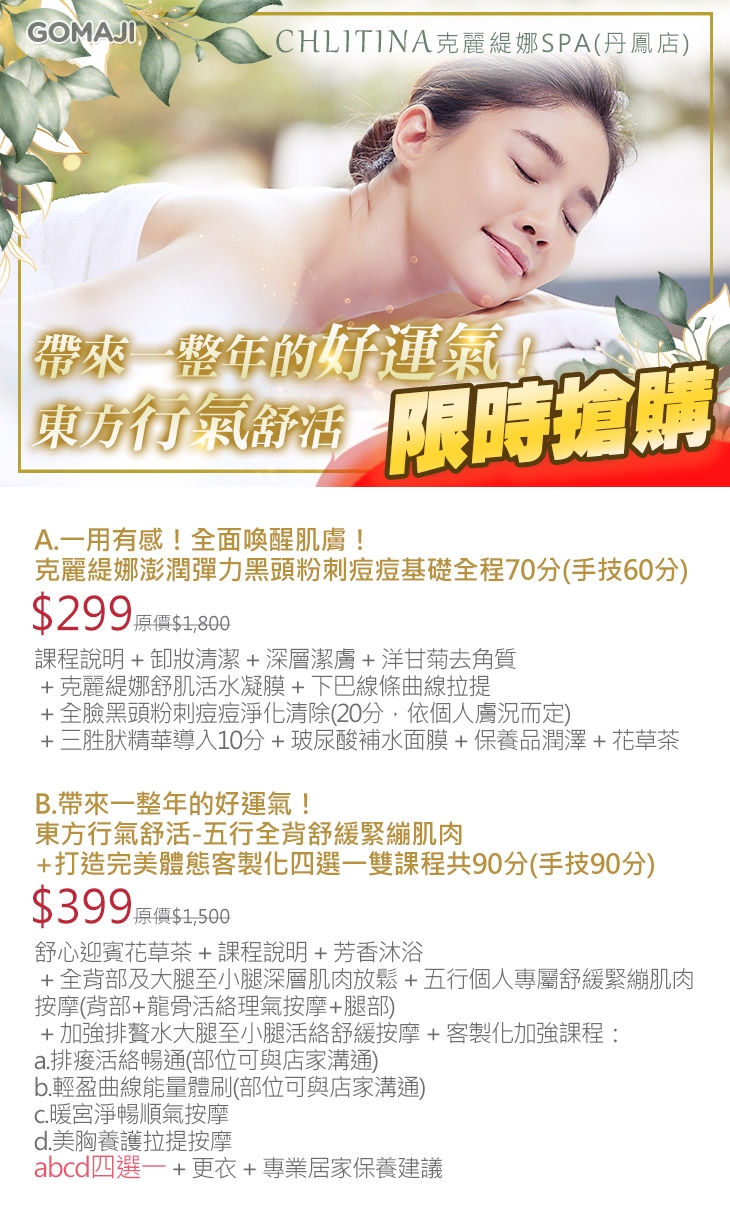A.一用有感!全面喚醒肌膚!克麗緹娜澎潤彈力黑頭粉刺痘痘基礎全程70分(手技60分) / B.帶來一整年的好運氣!東方行氣舒活-五行全背舒緩緊繃肌肉+打造完美體態客製化四選一雙課程共90分(手技90分)