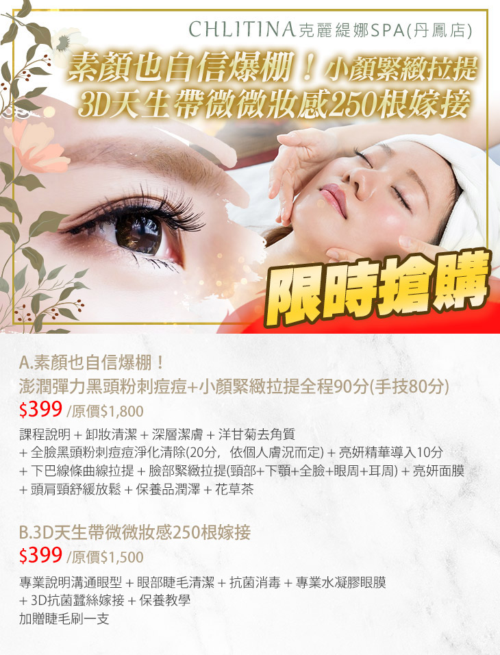 A.素顏也自信爆棚!澎潤彈力黑頭粉刺痘痘+小顏緊緻拉提全程90分(手技80分) / B.3D天生帶微微妝感250根嫁接