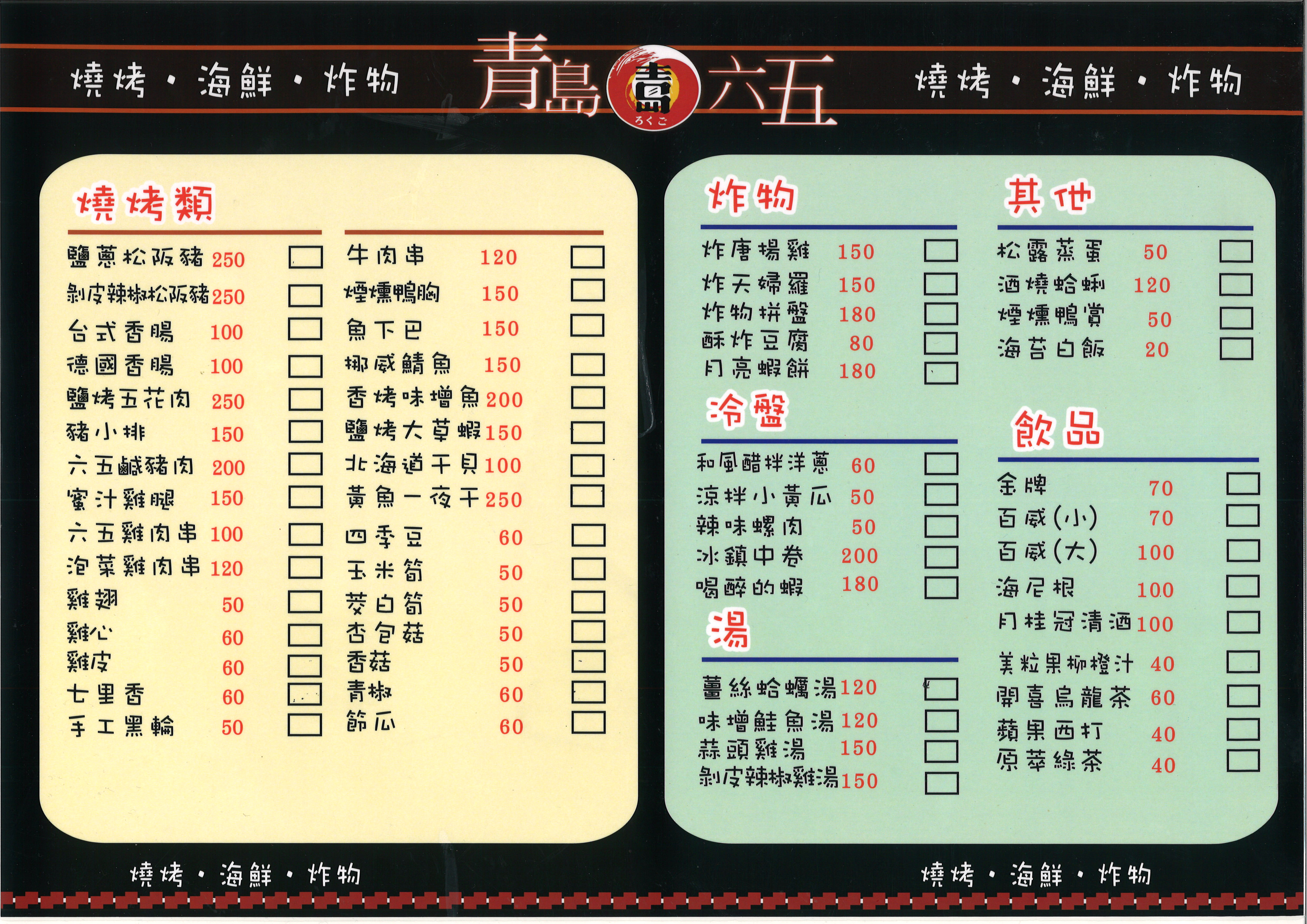位於高雄市三民區青島街上的【青島六五】,專營平價美味的燒烤料理,無論是鹹豬肉、一夜干、炸蝦天婦羅等餐點皆讓人毫無挑剔之處,尤其光看菜單更陷入難以抉擇的窘境,每一種都好誘人!嚴選新鮮食材搭配上師傅的真功夫,充份表現出食材的真與鮮,用料大方不手軟,口口都是紮實而多層次的美味,現在就快揪親朋好友一起來嚐鮮吧!