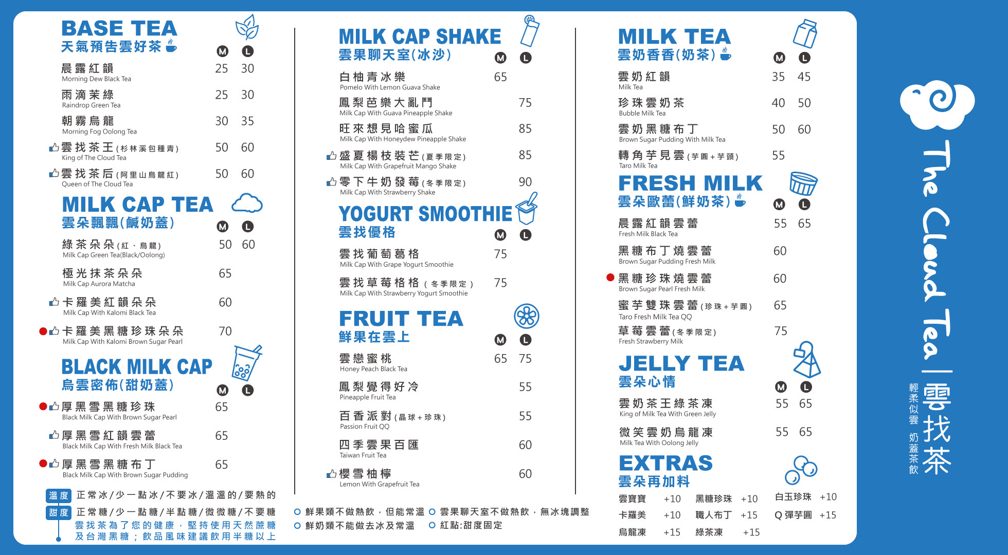 因應台灣飲茶文化的進程,【雲找茶】以現今最受歡迎的「奶蓋茶系列」為主角,搭配口味多元、豐富的手搖茶飲,研發並設計出品項眾多、充滿新意的菜單,呈現品牌專屬的「茶」魅力!