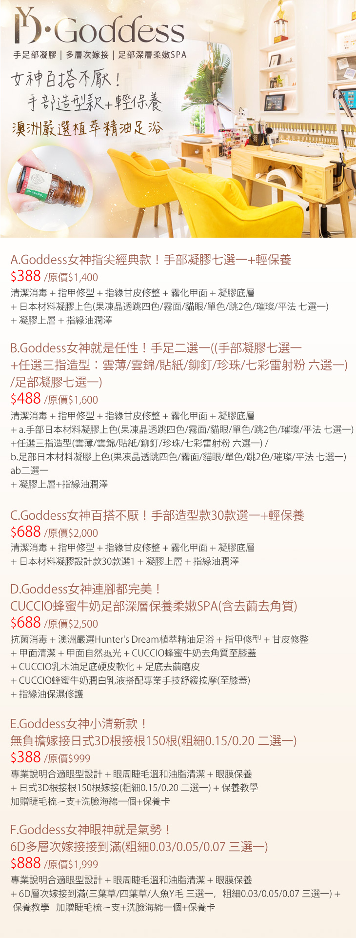A.指尖經典款!手部凝膠七選一+輕保養/B.就是任性!手足二選一((手部凝膠七選一+任選三指造型:雲薄/雲錦/貼紙/鉚釘/珍珠/七彩雷射粉 六選一)/足部凝膠七選一)/C.百搭不厭!手部造型款30款選一+輕保養/D.連腳都完美!CUCCIO蜂蜜牛奶足部深層保養柔嫩SPA(含去繭去角質)/E.小清新款!無負擔嫁接日式3D根接根150根(粗細0.15/0.20 二選一)/F.眼神就是氣勢!6D多層次嫁接接到滿(粗細0.03/0.05/0.07