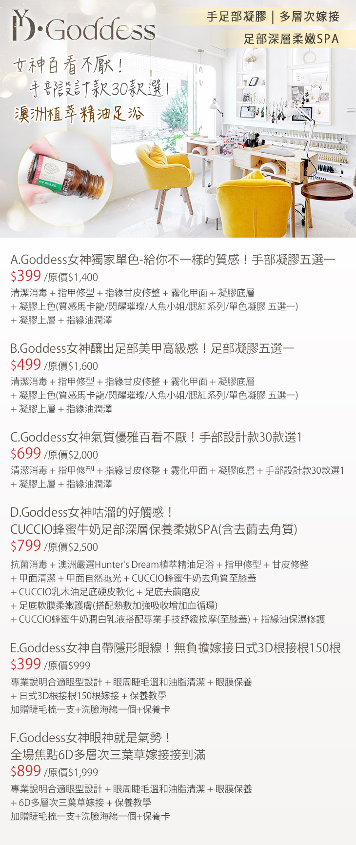 A.Goddess女神獨家單色-給你不一樣的質感!手部凝膠五選一 / B.Goddess女神釀出足部美甲高級感!足部凝膠五選一 / C.Goddess女神氣質優雅百看不厭!手部設計款30款選1 / D.Goddess女神咕溜的好觸感!CUCCIO蜂蜜牛奶足部深層保養柔嫩SPA(含去繭去角質) / E.Goddess女神自帶隱形眼線!無負擔嫁接日式3D根接根150根 / F.Goddess女神眼神就是氣勢!全場焦點6D多層次三葉草嫁接接到滿