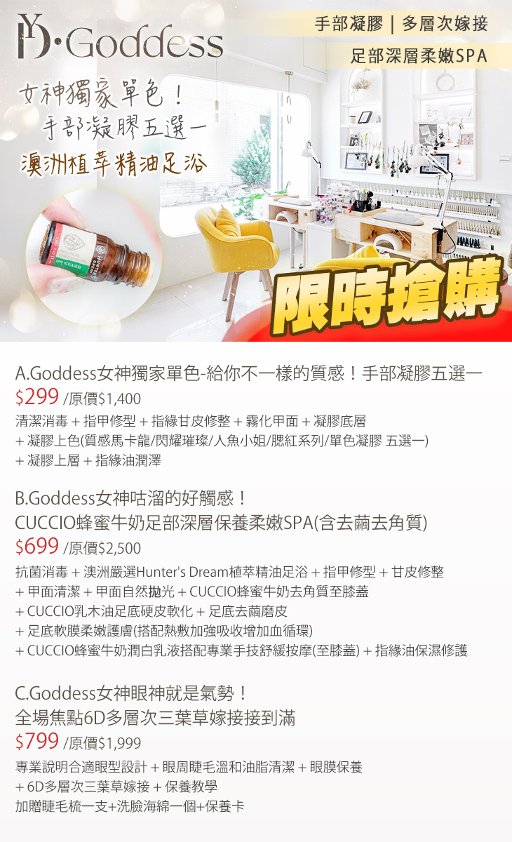 A.Goddess女神獨家單色-給你不一樣的質感!手部凝膠五選一 / B.Goddess女神咕溜的好觸感!CUCCIO蜂蜜牛奶足部深層保養柔嫩SPA(含去繭去角質) / C.Goddess女神眼神就是氣勢!全場焦點6D多層次三葉草嫁接接到滿