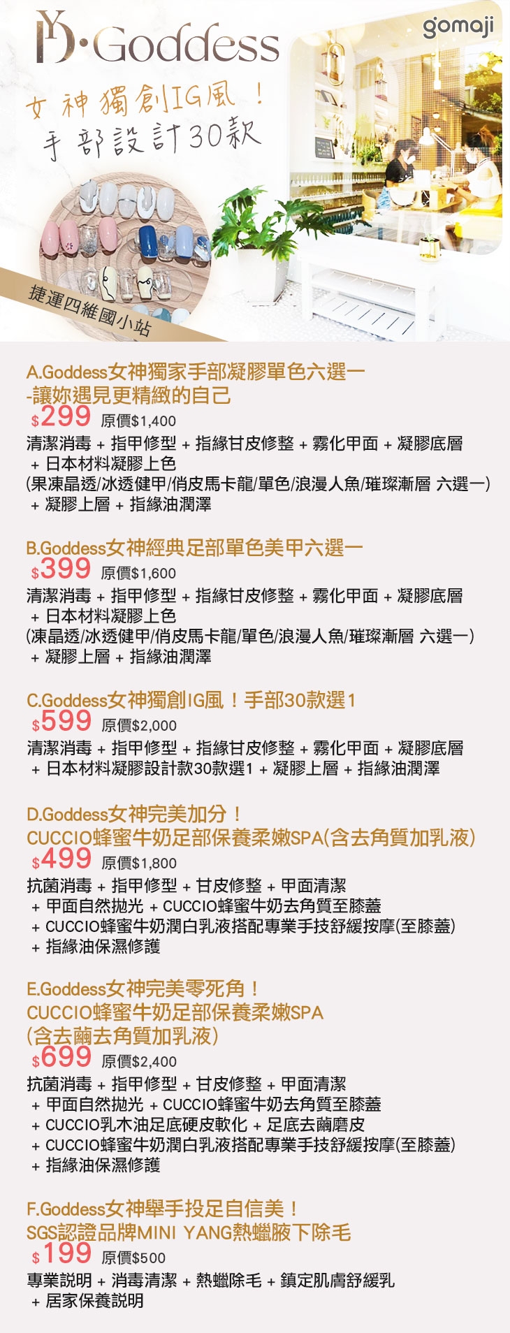 A.Goddess女神獨家手部凝膠單色六選一-讓妳遇見更精緻的自己/B.Goddess女神經典足部單色美甲六選一/C.Goddess女神獨創IG風!手部30款選1/D.Goddess女神完美加分!CUCCIO蜂蜜牛奶足部保養柔嫩SPA(含去角質加乳液)/E.Goddess女神完美零死角!CUCCIO蜂蜜牛奶足部保養柔嫩SPA(含去繭去角質加乳液)/F.女神舉手投足自信美!SGS認證品牌MINI YANG熱蠟腋下除毛