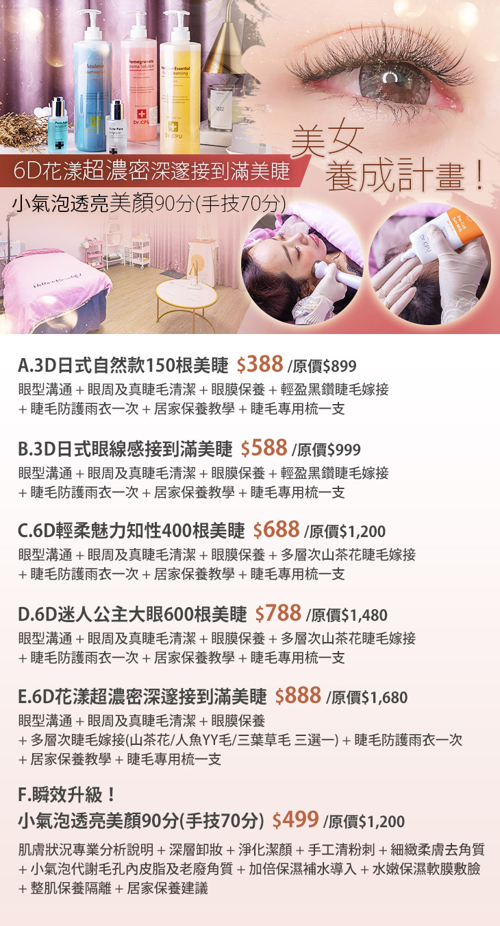 A.3D日式自然款150根美睫 / B.3D日式眼線感接到滿美睫 / C.6D輕柔魅力知性400根美睫 / D.6D迷人公主大眼600根美睫 / E.6D花漾超濃密深邃接到滿美睫 / F.瞬效升級!小氣泡透亮美顏90分(手技70分)