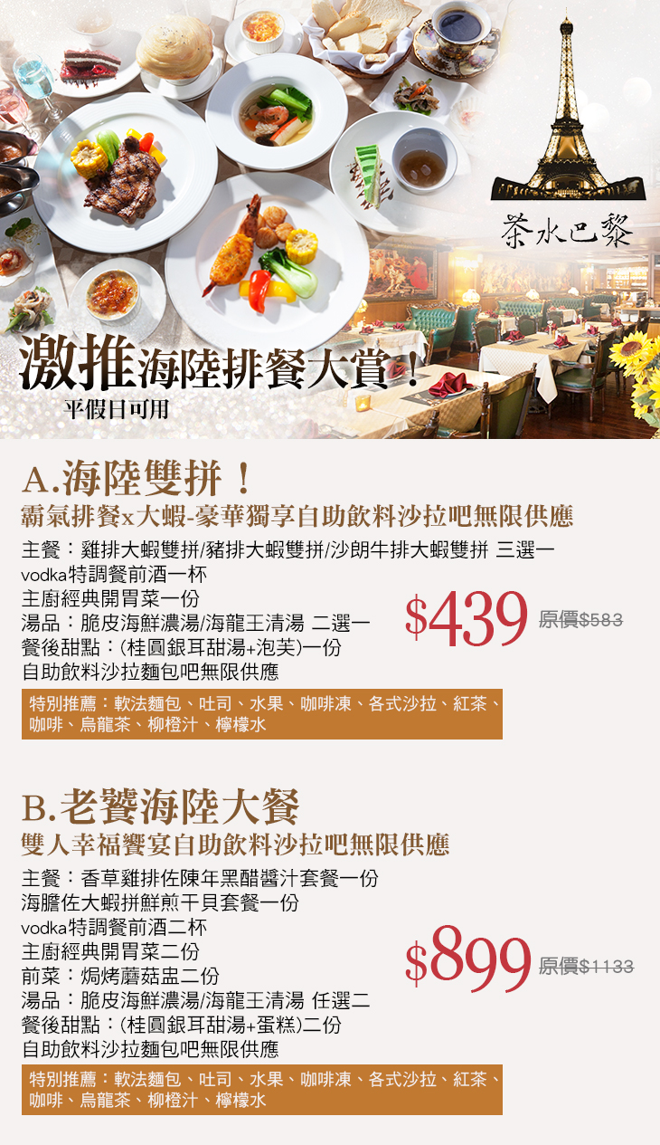 ▩B.老饕海陸大餐-雙人幸福饗宴自助飲料沙拉吧無限供應