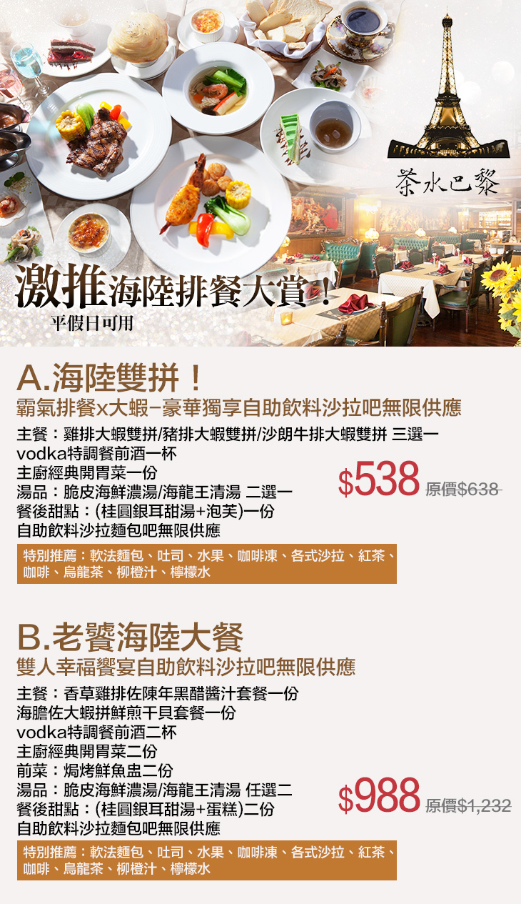 ▩B.老饕海陸大餐-雙人幸福饗宴自助飲料沙拉吧無限供應