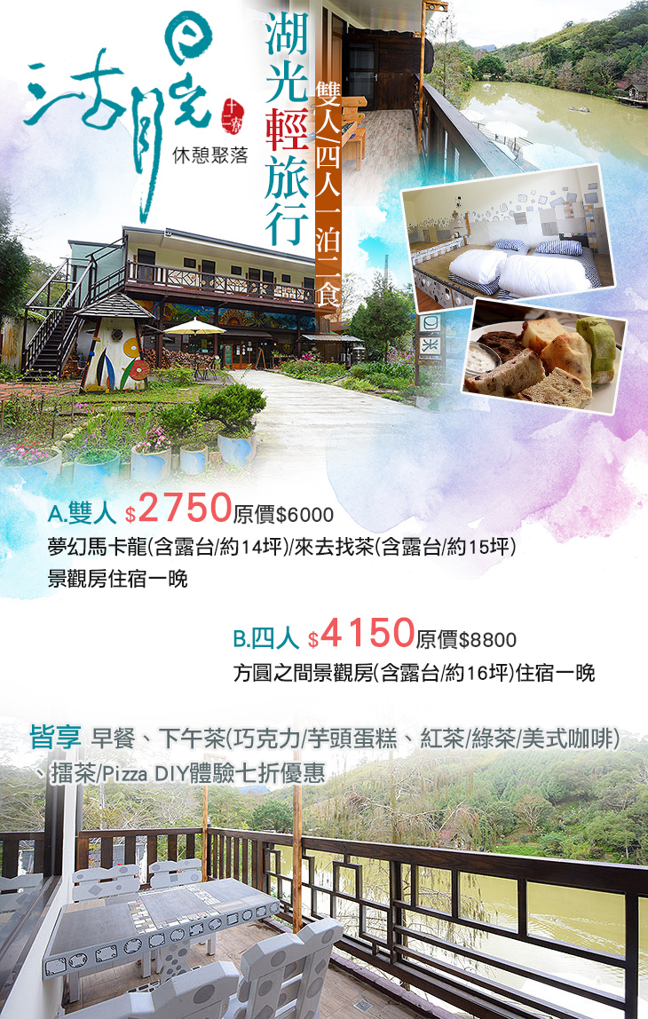 ★ 客房皆有露台面向山水湖景,約14~16坪非常寬敞!可加價加人至4-6個人入住,皆為原創藝術設計風格,與家人好友在湖光山色景致下聊天話家常。