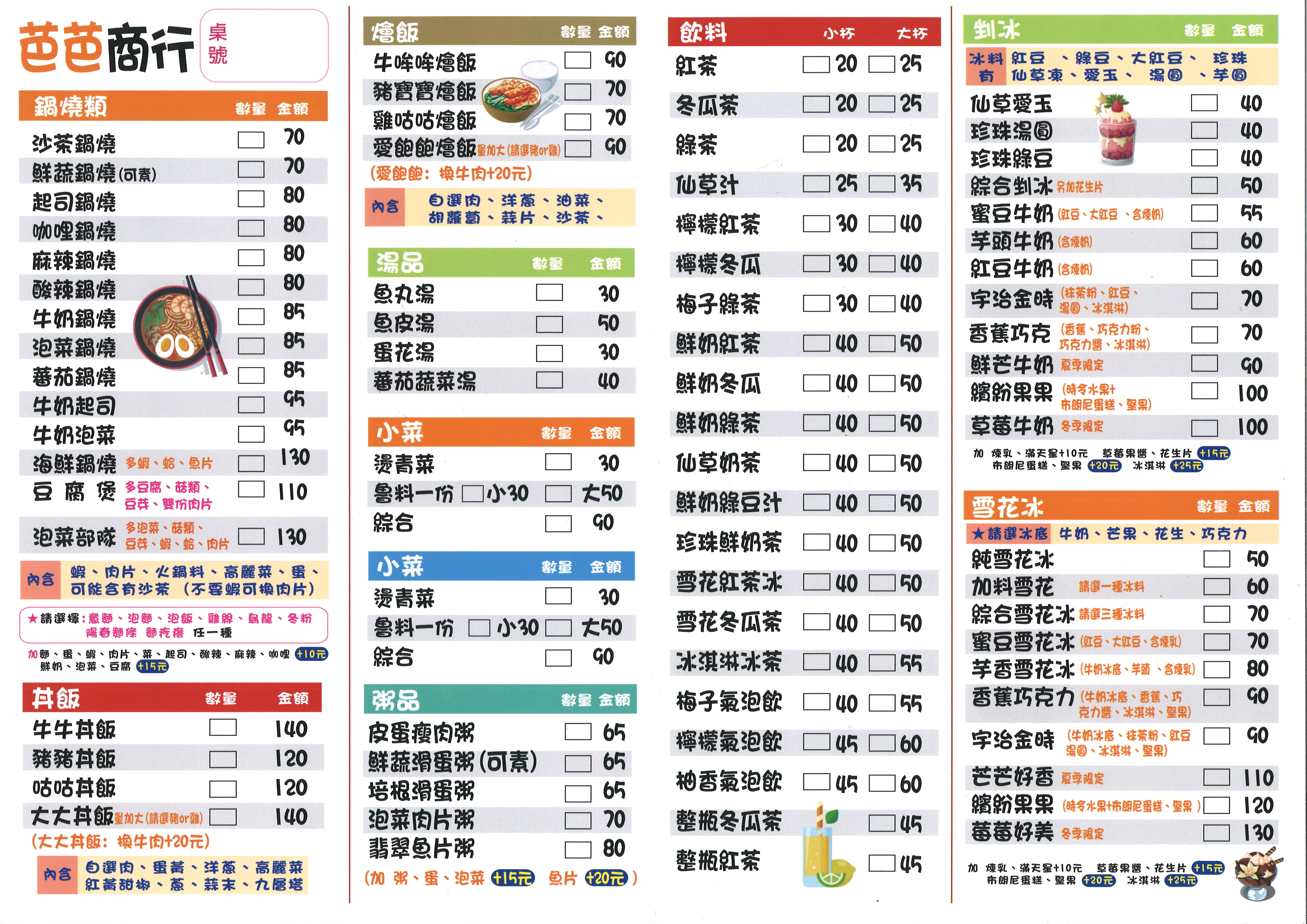 主打豐盛美味的鍋燒類、燴飯、丼飯、粥品、甜品、剉冰等系列品項,全方位滿足您貪饞又挑剔的味蕾~堅持選用新鮮、優質的食材與原料,透過店家的嫻熟手藝、獨門配方,融入匠心巧思,將為您呈現風味多元、料好實在的佳餚!覺得肚子有些餓了嗎?或是午後有點嘴饞?不妨相揪親朋好友一同前來【芭芭商行】,享受美食帶來的喜悅與驚喜,為平凡的日常點綴悠閒、愜意的片刻~