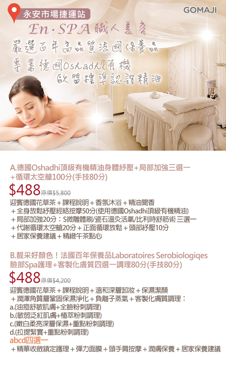 A.德國Oshadhi頂級有機精油身體紓壓+局部加強三選一+循環太空艙100分(手技80分) / B.靓采好顏色!法國百年保養品Laboratoires Serobiologiqes臉部Spa護理+客製化膚質四選一調理80分(手技80分)