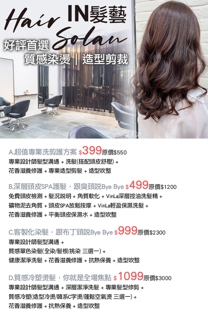 A.超值專業洗剪護方案 / B.深層頭皮SPA護髮,跟臭頭說Bye Bye / C.客製化染髮,跟布丁頭說Bye Bye / D.質感冷塑燙髮,你就是全場焦點