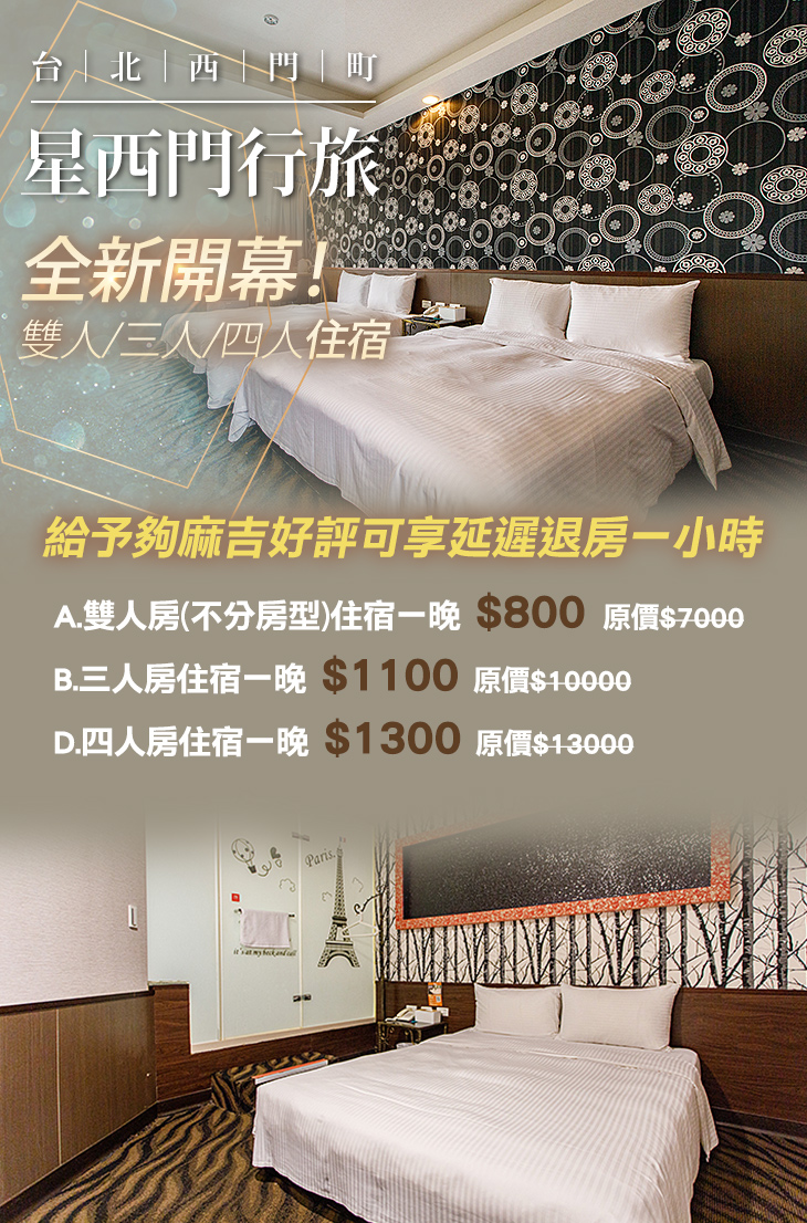 位於繁華熱鬧的西門町,擁有絕佳的地理位置與便捷的交通網絡,無論想要逛街、購物、看電影,或是品嚐在地美食等都能滿足您,【星西門行旅】提供親切熱情的服務品質,致力於打造令人感到自在、放鬆的休憩環境,讓每位遠道而來的旅客都能享受難得的悠閒時光,每分每秒都備感幸福!