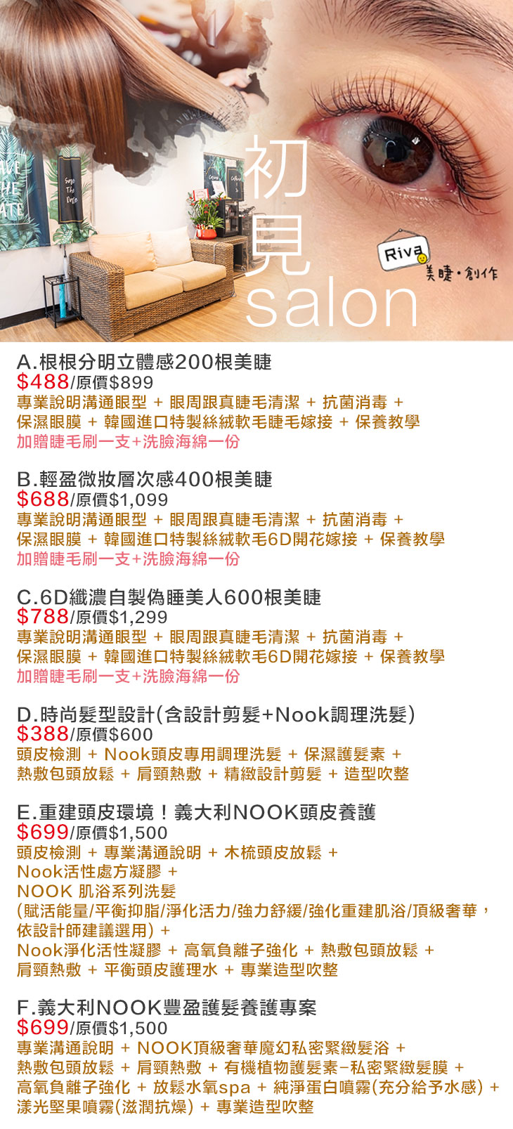 A.根根分明立體感200根美睫 / B.輕盈微妝層次感400根美睫 / C.6D纖濃自製偽睡美人600根美睫 / D.時尚髮型設計(含設計剪髮+Nook調理洗髮) / E.重建頭皮環境!義大利NOOK頭皮養護 / F.義大利NOOK豐盈護髮養護專案