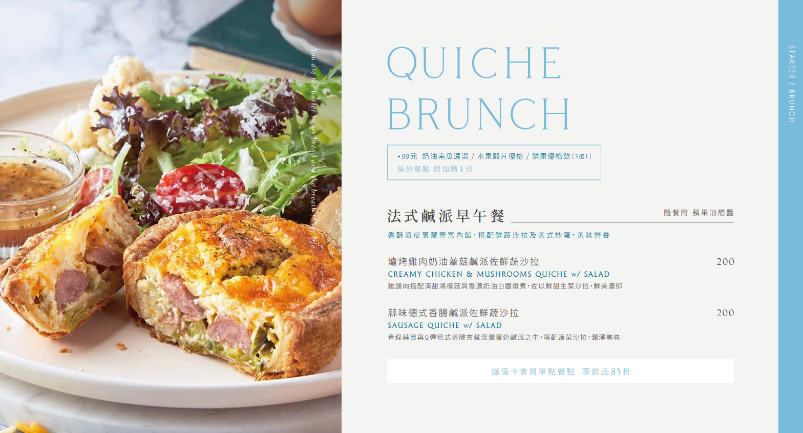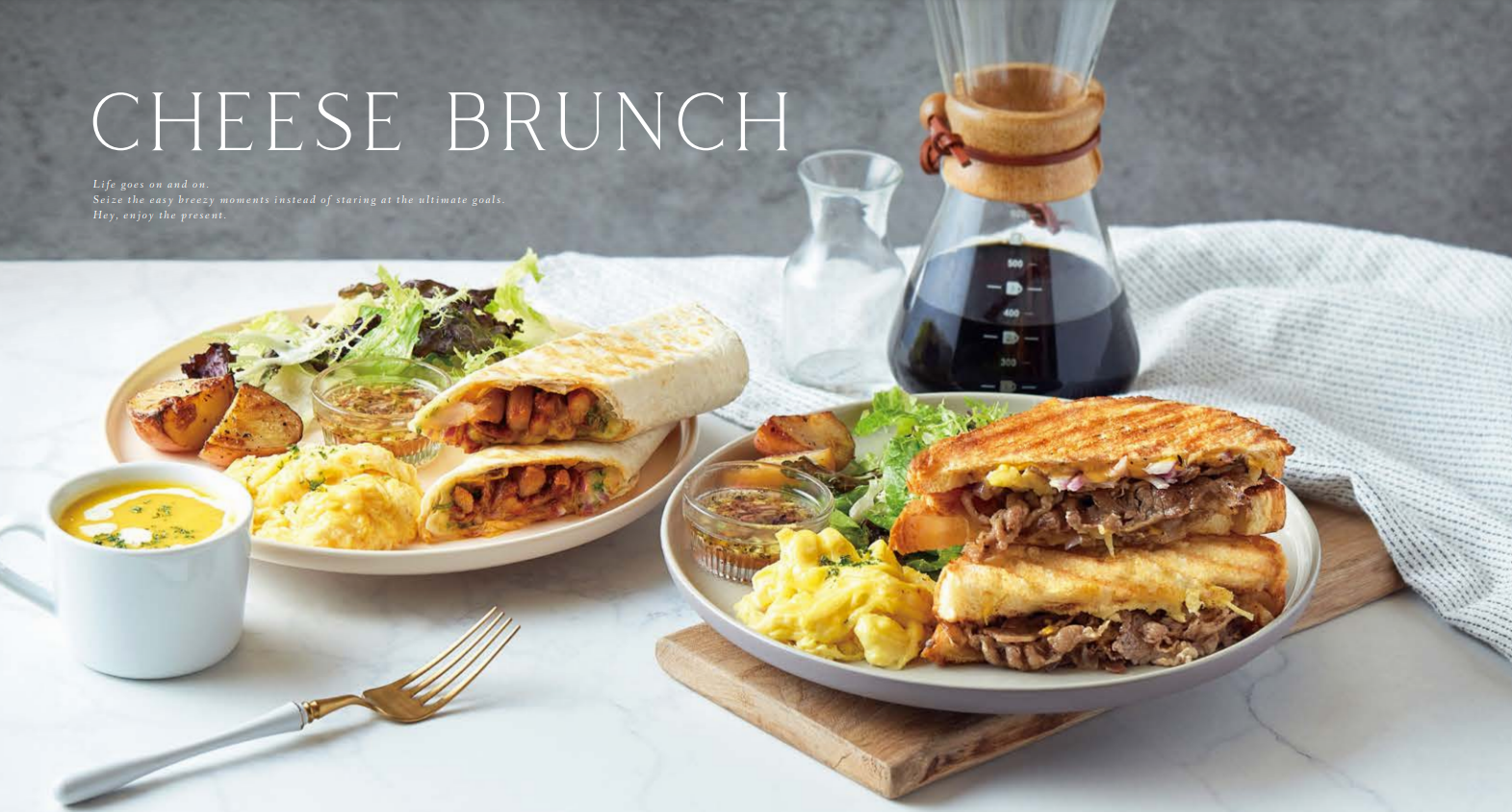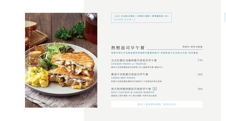 焦脆丹麥吐司及酥香墨西哥捲餅夾藏濃郁起司,搭配鮮蔬沙拉及美式炒蛋,美味豐盛。雞肉以百里香醃製後低溫舒肥,佐以馥郁黑松露,鹹甜可口。