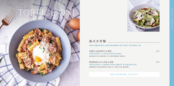 煙燻鴨胸及培根搭配濃郁奶油白醬,拌入滑嫩水波蛋,Q彈水管麵有特殊空心造型及紋路,使醬汁能均勻吸附,享受多層次口感,鹹香濃郁。