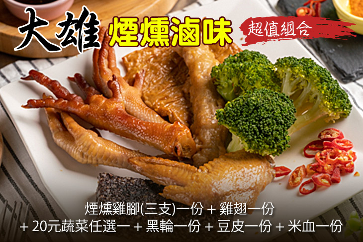 超值特餐,以店內最有人氣的煙燻雞腳為主角,搭配吮指可口的雞翅,以及可自行挑選、清甜爽口的蔬菜,還有滷味最經典的豆皮、米血、黑輪…豐富的品項,絕對讓您大飽口福!